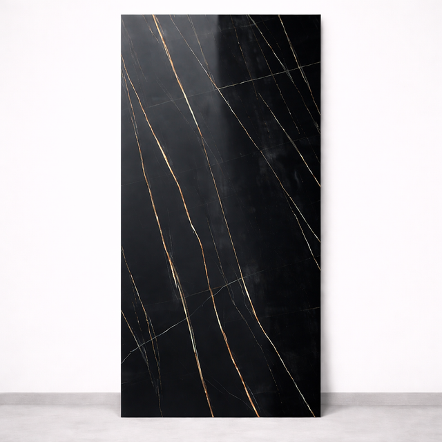Il pannello PVC effetto marmo nero è un rivestimento decorativo dal forte impatto visivo, caratterizzato da una base nera profonda attraversata da venature sottili nei toni dell’oro e del bianco, che richiamano l’eleganza del marmo naturale di alta gamma.