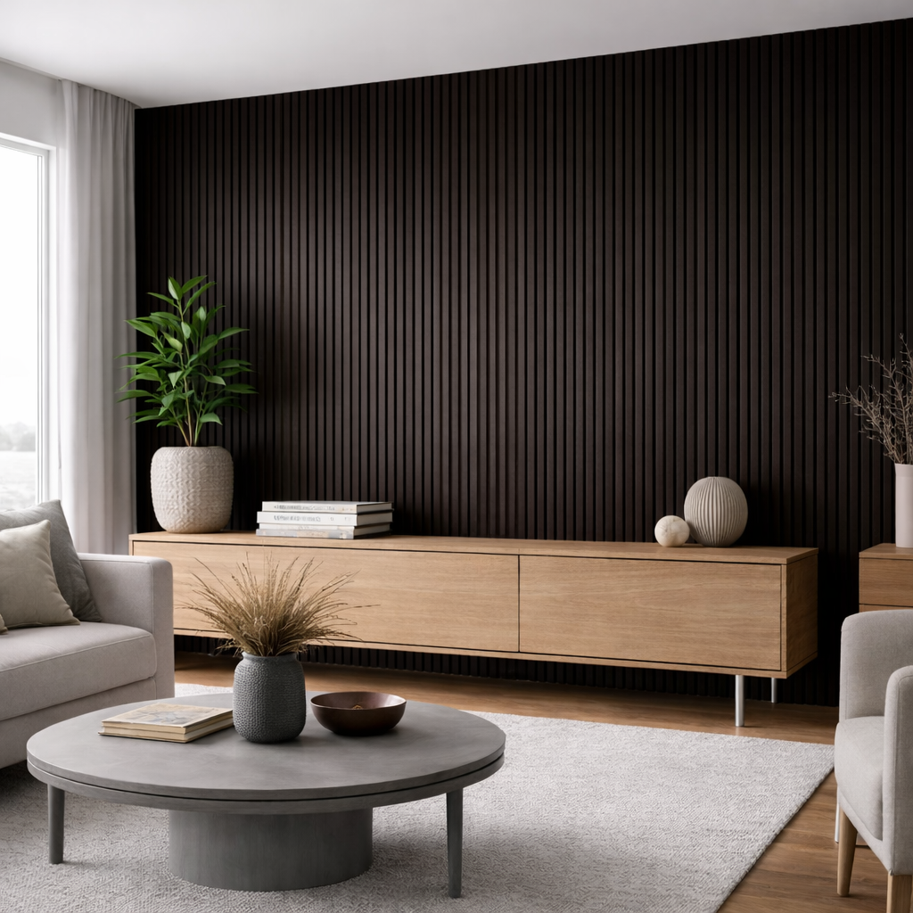 I listelli in MDF effetto legno sono fissati su un supporto fonoassorbente nero, studiato per migliorare il comfort acustico degli ambienti riducendo il riverbero sonoro, senza rinunciare al design.