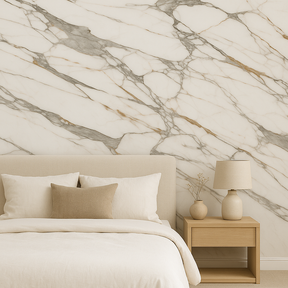 Trasforma i tuoi spazi con Euphoria, il rotolo adesivo in PVC che riproduce fedelmente l'eleganza del marmo Calacatta. Le sue venature grigio-perlate con sfumature dorate su fondo bianco donano luce, raffinatezza e un tocco di lusso a qualsiasi ambiente.